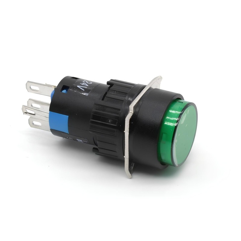 Кнопка LAY90-22D предназначена для использования в электрических схемах управления и оснащена подсветкой. Зеленый цвет указывает на состояние готовности или включения, обеспечивая четкую визуальную индикацию.