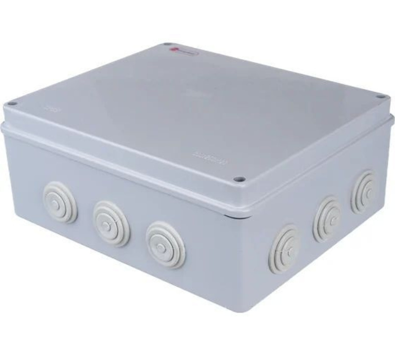 Электрическая коробка распределительная герметичная наружного монтажа из не поддерживающего горения ударостойкого АБС пластика с непрозрачной крышкой и кабельными вводами из ПВХ пластиката на стенках. Внутренняя часть дна коробки имеет пластиковые монтажные рейки для крепления электрических клемм. Коробка распределительная используется для защиты мест соединения кабелей при открытой проводке электрических сетей с напряжением до 400V в запыленных и влажных помещениях.