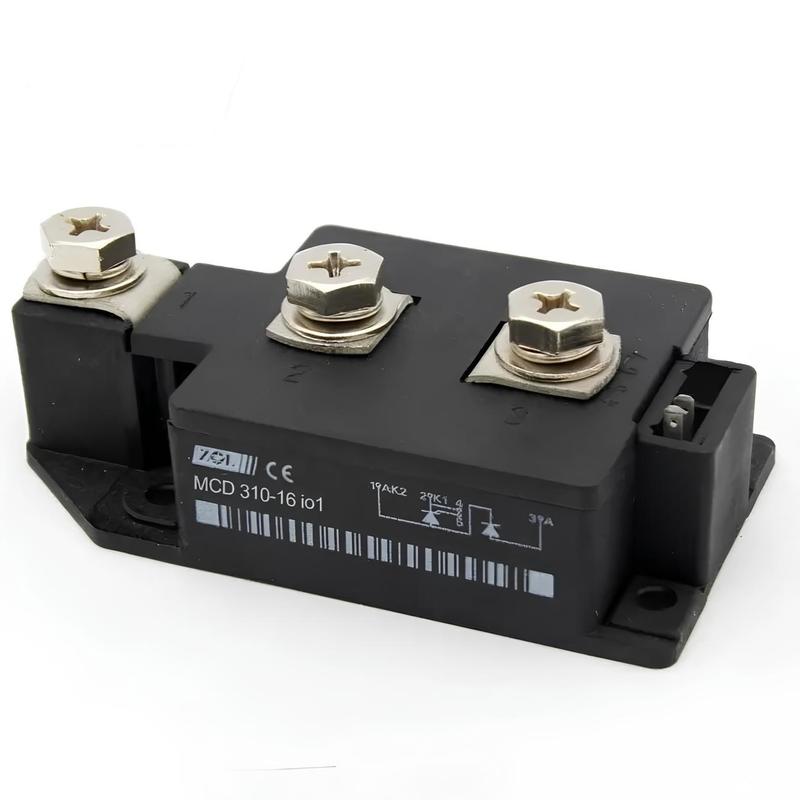 MCD310-16/O1 — это двойной тиристорный модуль с общим анодом или катодом (в зависимости от исполнения), предназначенный для работы в промышленных системах управления питанием, фазовом управлении, выпрямителях, плавных пусках двигателей и других силовых приложениях. Обеспечивает надёжную работу при высоких токах и напряжениях, совместим с системами охлаждения через радиатор.