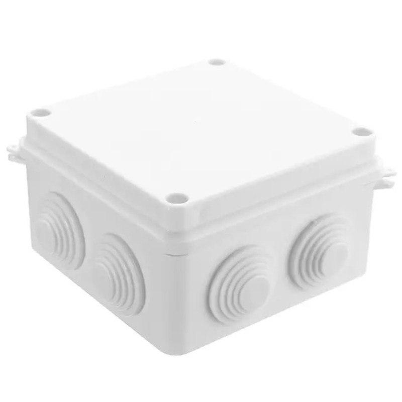 Электрическая коробка распределительная герметичная наружного монтажа из не поддерживающего горения ударостойкого АБС пластика с непрозрачной крышкой и кабельными вводами из ПВХ пластиката на стенках. Внутренняя часть дна коробки имеет пластиковые монтажные рейки для крепления электрических клемм. Коробка распределительная используется для защиты мест соединения кабелей при открытой проводке электрических сетей с напряжением до 400V в запыленных и влажных помещениях.