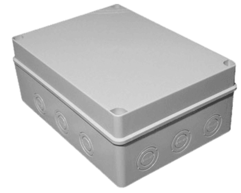 Электрическая коробка распределительная герметичная наружного монтажа из не поддерживающего горения ударостойкого АБС пластика с непрозрачной крышкой и кабельными вводами из ПВХ пластиката на стенках. Внутренняя часть дна коробки имеет пластиковые монтажные рейки для крепления электрических клемм. Коробка распределительная используется для защиты мест соединения кабелей при открытой проводке электрических сетей с напряжением до 400V в запыленных и влажных помещениях.