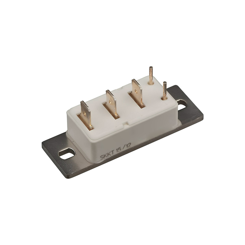 Тиристорный модуль SKKT15/12E предназначен для управления высоковольтными и мощными электрическими цепями. Он используется в промышленных применениях, таких как управление мощностью, преобразователи и регуляторы.