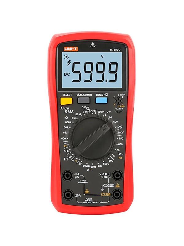 UNI-T UT890C — универсальный профессиональный цифровой мультиметр с широким набором функций для измерения основных электрических параметров. Подходит как для бытового использования, так и для ремонта, диагностики и электромонтажных работ. Обладает высокой точностью, удобным большим экраном с подсветкой и полезными дополнительными функциями.